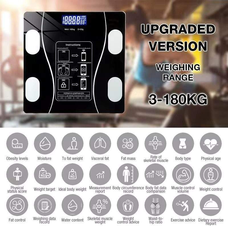 🔸 Medición y registro del peso corporal, el IMC, la grasa corporal, el agua corporal, la grasa visceral, la masa muscular, la masa ósea, las proteínas, la obesidad, la edad corporal, el LBM y el metabolismo;