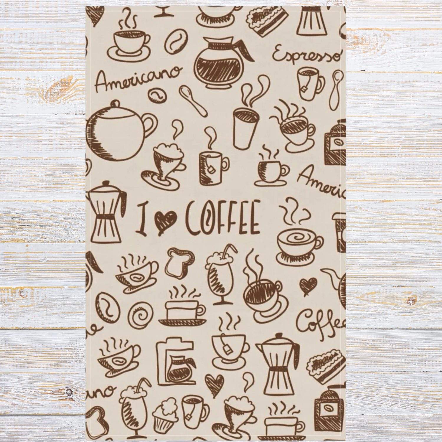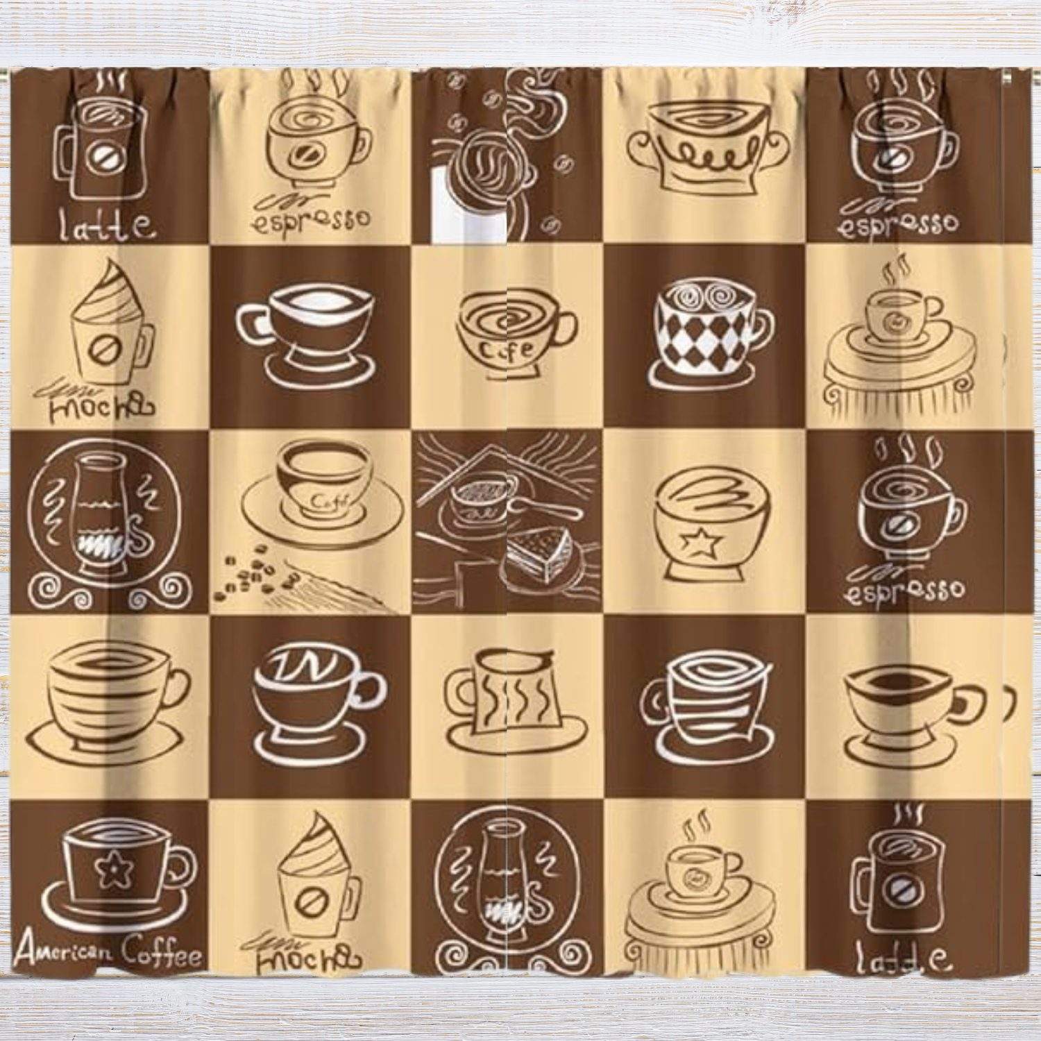 🔸 Diseño: Estampado colorido con ilustraciones de tazas, cafeteras y frases como coffee, cappuccino, milk y cocoa.