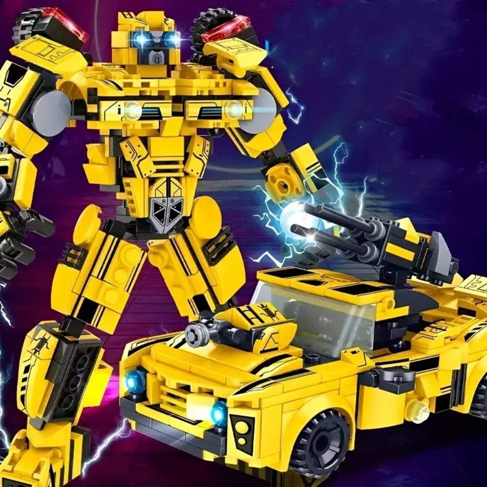 El diseño de robot amarillo nos trae a la mente el icónico transfomer Bumblebee, éste permite construir nos opciones de diseño, ya sea el automóvil deportivo o el robot modelos transformer.