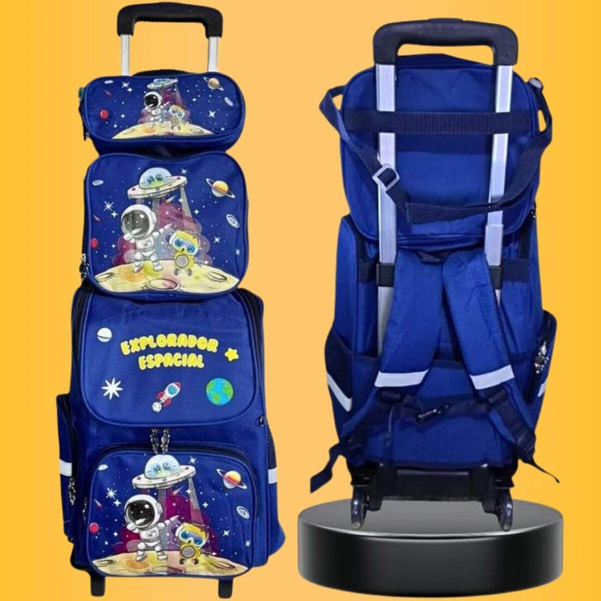 🔸 Incluye: 1 mochila, 1 lonchera térmica, 1 cartuchera y 1 carrito desmontable.