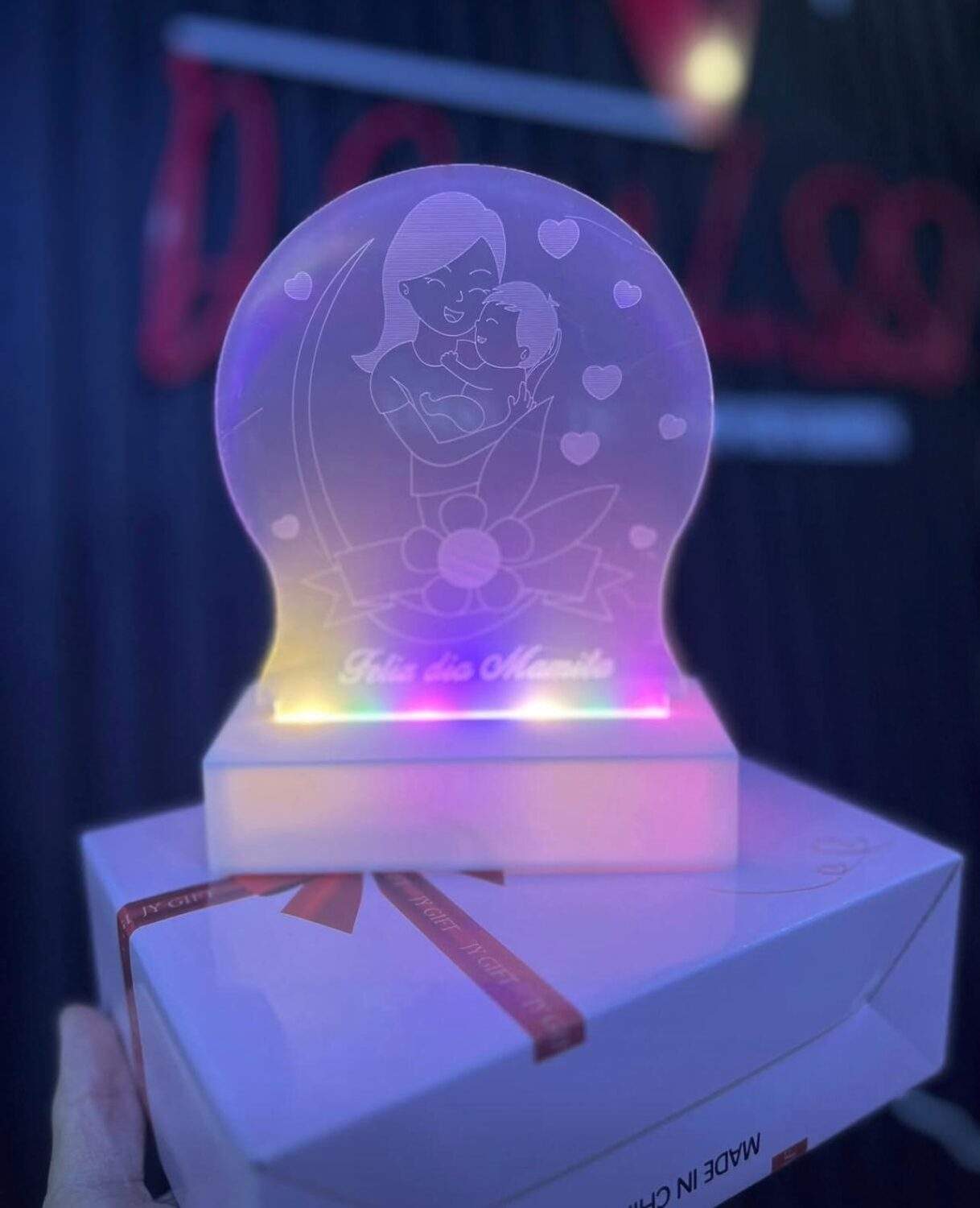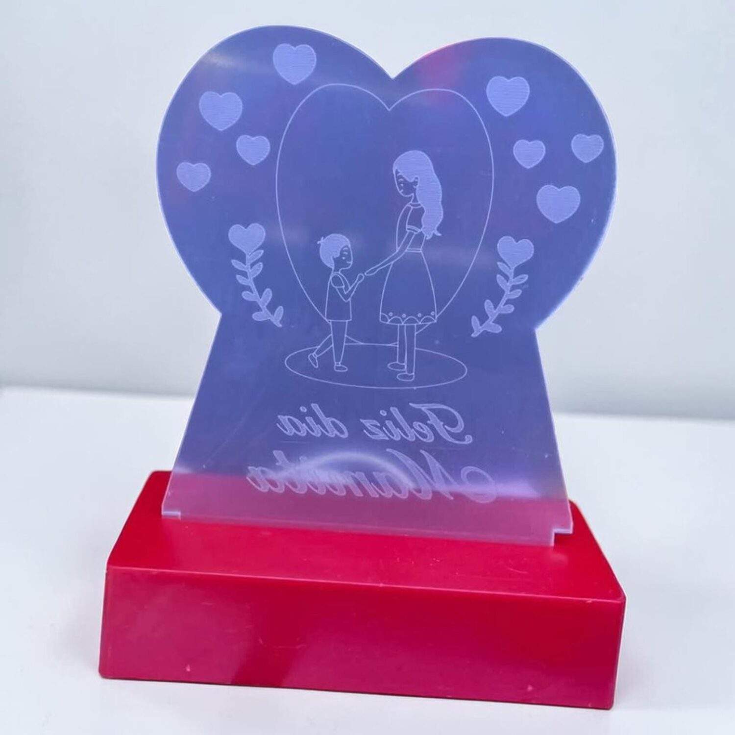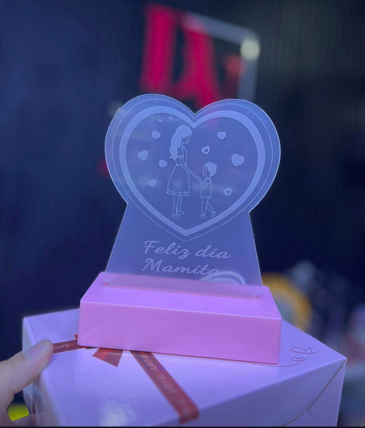 Sorprende con un detalle único y lleno de amor. Esta hermosa lámpara LED cuenta con un diseño en acrílico en forma de corazón, grabado con una delicada escena de mamá e hijo, rodeada de pequeños corazones que transmiten cariño y ternura.
