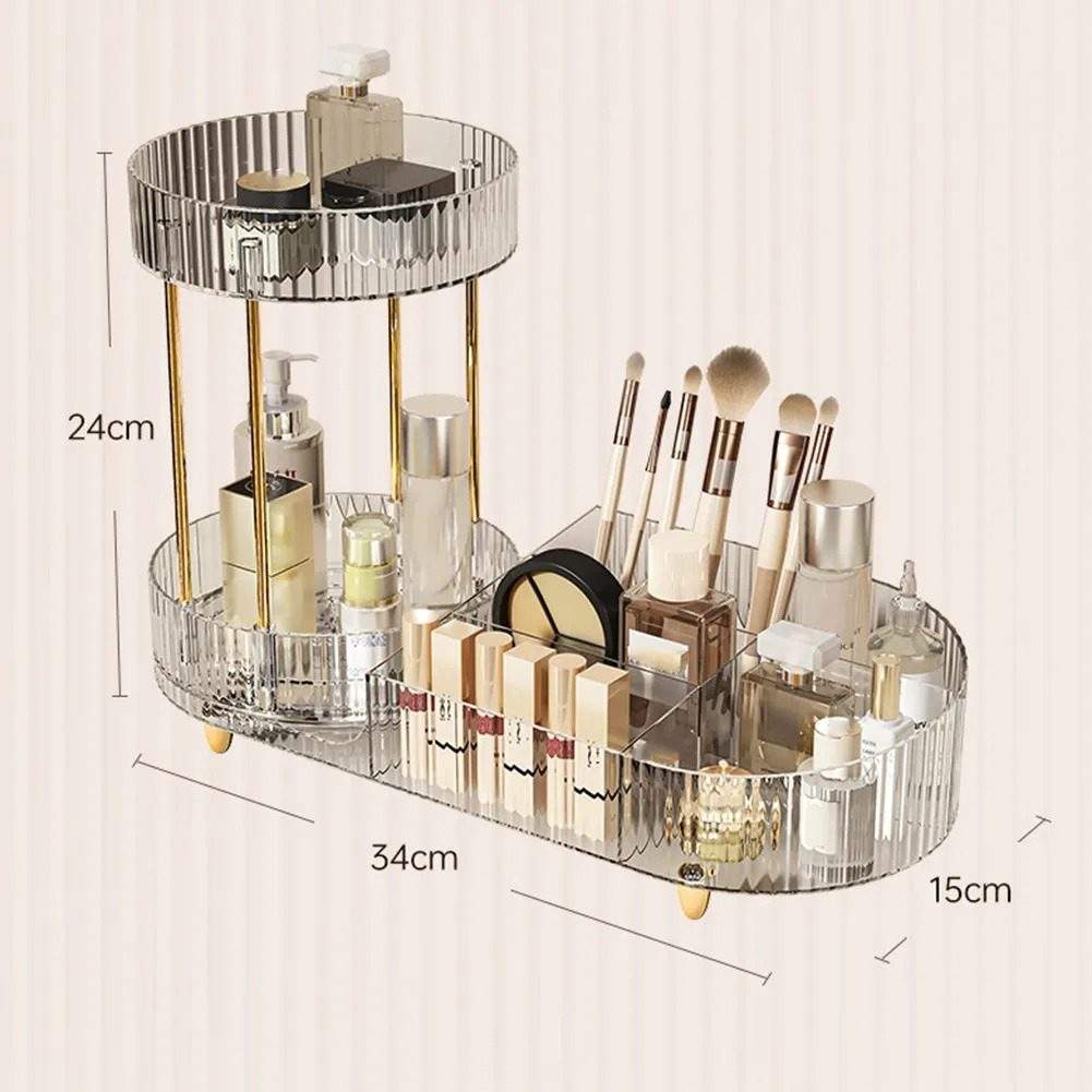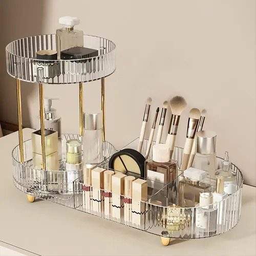 Dale un toque elegante y ordenado a tu tocador con este moderno organizador multifuncional. Su diseño de doble nivel con acabados transparentes y detalles dorados no solo luce sofisticado, sino que también te permite tener todos tus productos al alcance de la mano.