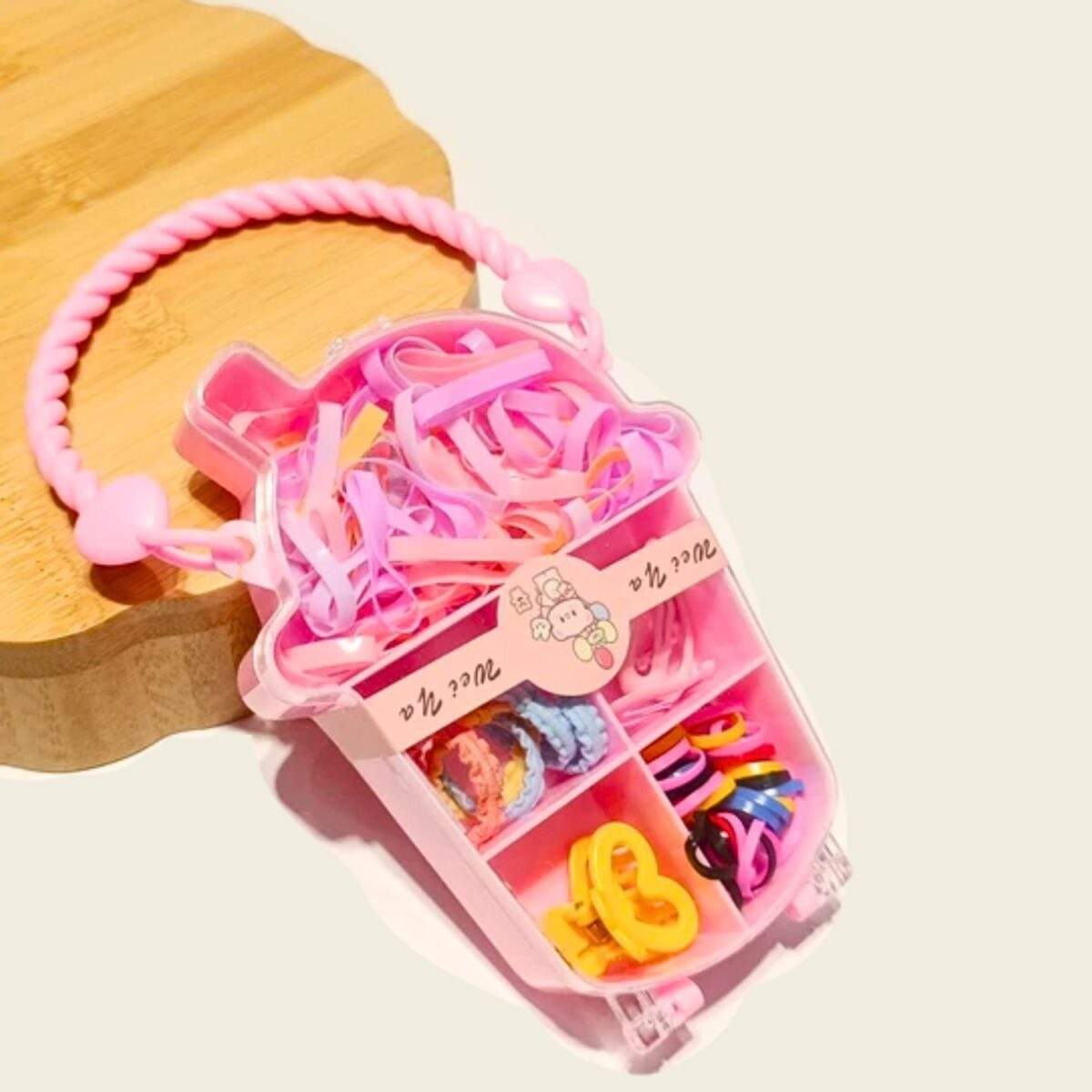 Mantén siempre a mano tus accesorios para el cabello con este adorable organizador portátil. Su diseño compacto en color rosa incluye diferentes compartimentos para guardar ligas, gomitas, pinzas y bandas elásticas, manteniéndolos ordenados y listos para usar.